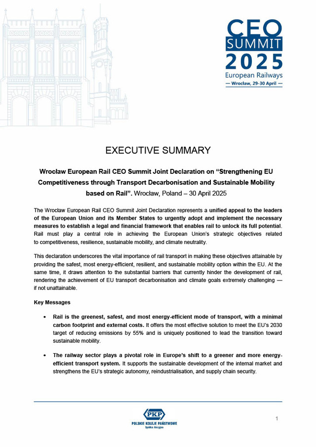 At the European Rail CEO Summit held in Wrocław on 30 April 2025, the leaders of the European railway sector adopted a joint declaration calling on the European Union and its Member States to place rail at the core of Europe’s strategies for competitiveness, sustainability, and climate neutrality.