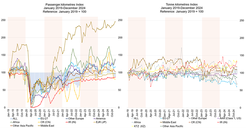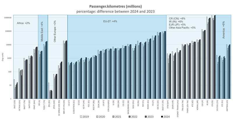 On the other hand, rail freight transport in 2024 did not change, with no overall growth. This global stagnation is the result of opposing trends, with widespread decline in many companies, particularly across Europe, where freight traffic volumes fell by an estimated 8% in the EU-27, while being offset by significant growth in India, where Indian Railways recorded a 6% increase.