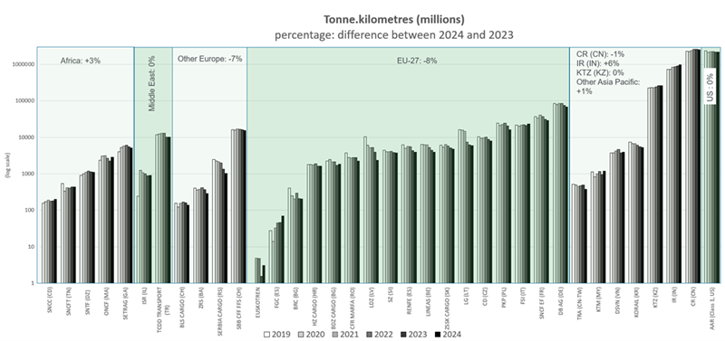 Supported by sustained growth, which is led by China Railways, Indian Railways, and Kazakhstan Railways (KTZ), Asia maintains a dominant position. In contrast, Europe is facing widespread decline, with notable drops in 2023 and 2024 for operators such as PKP, SNCF, DB, and Lithuanian Railways (LTG). Nonetheless, some companies, like FS, have managed to reverse this trend.