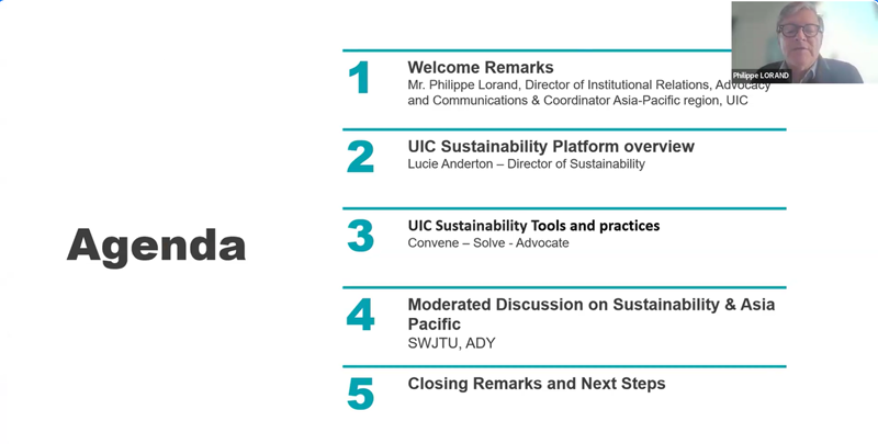 The session was opened by Philippe Lorand, Director of Institutional Relations, Advocacy and Communications & Coordinator Asia-Pacific Region, who emphasised the primary goal: to ensure a comprehensive understanding of UIC’s sustainability work.