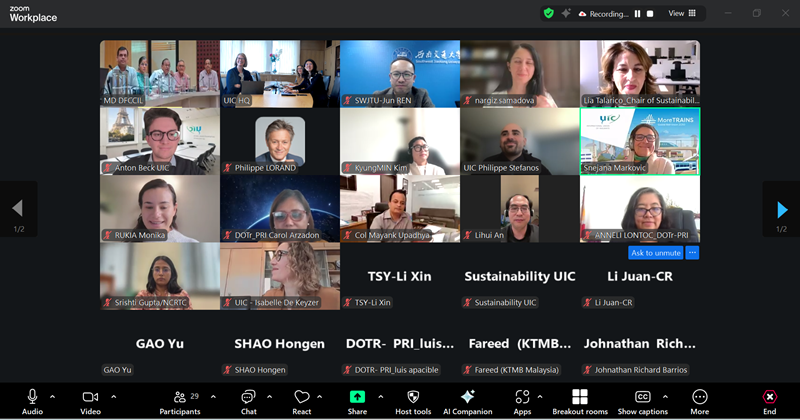 Following a successful series of regional web meetings, the UIC Asia-Pacific region held its fifth session on 10 October 2025, dedicated entirely to the work of the UIC Sustainability Platform and its activities and tools. The session provided a comprehensive overview of UIC’s integrated approach to environmental, social and economic sustainability, a topic that continues to be of great interest to UIC Asia-Pacific Regional Assembly (APRA) members.